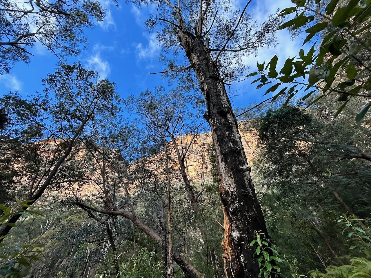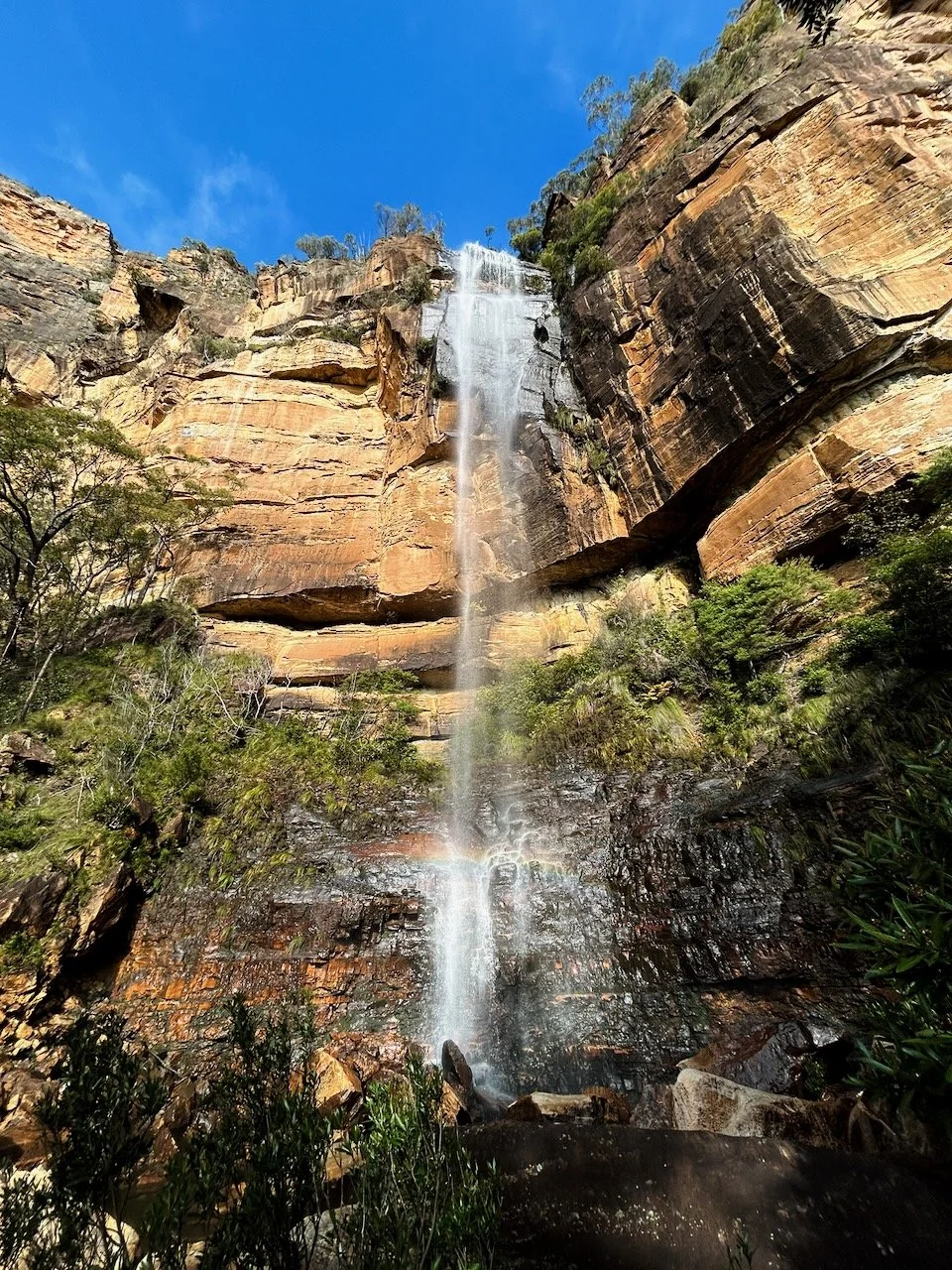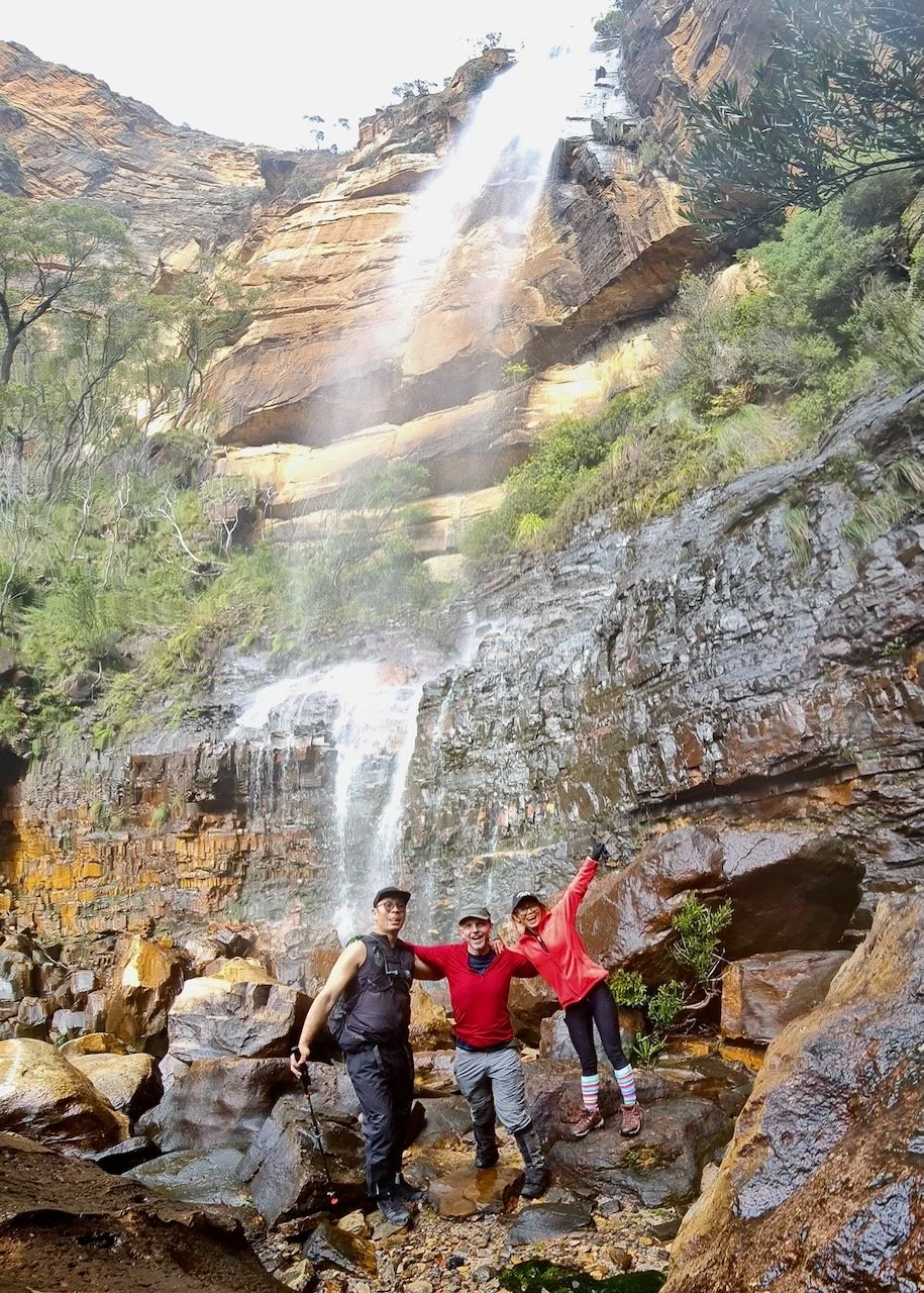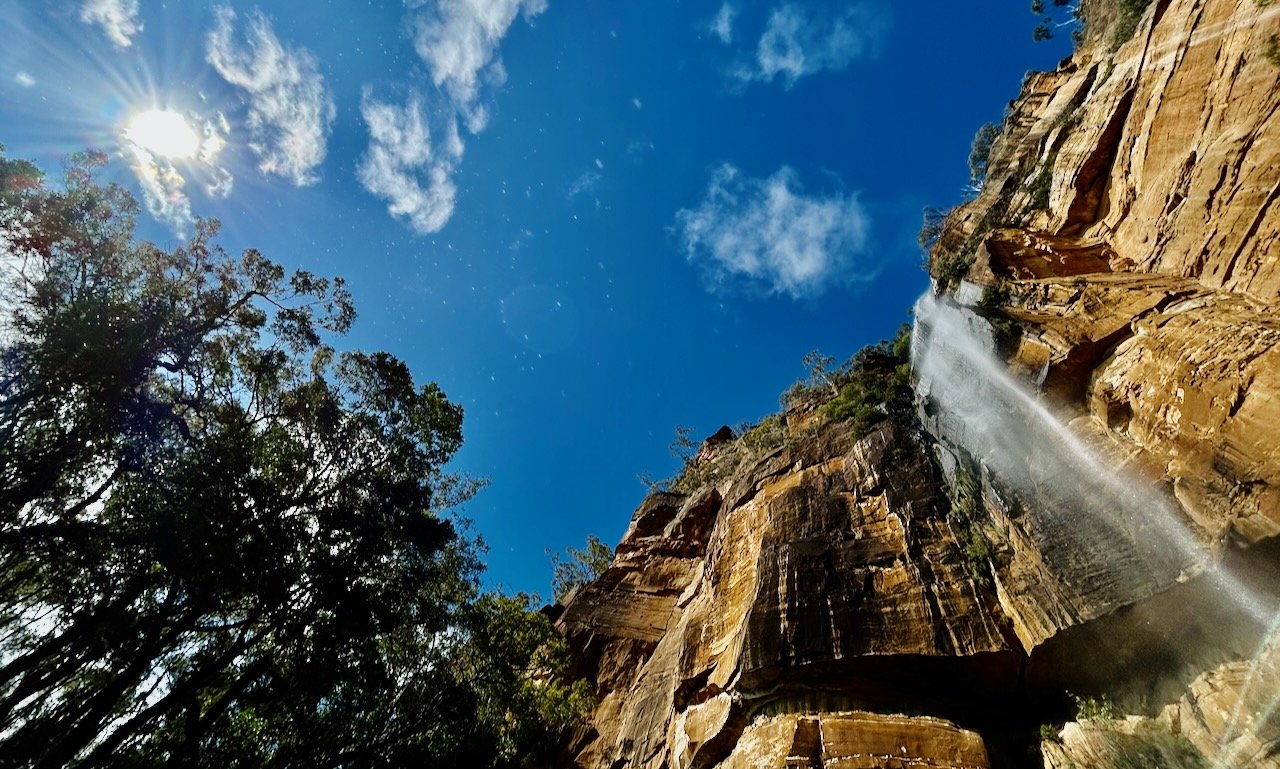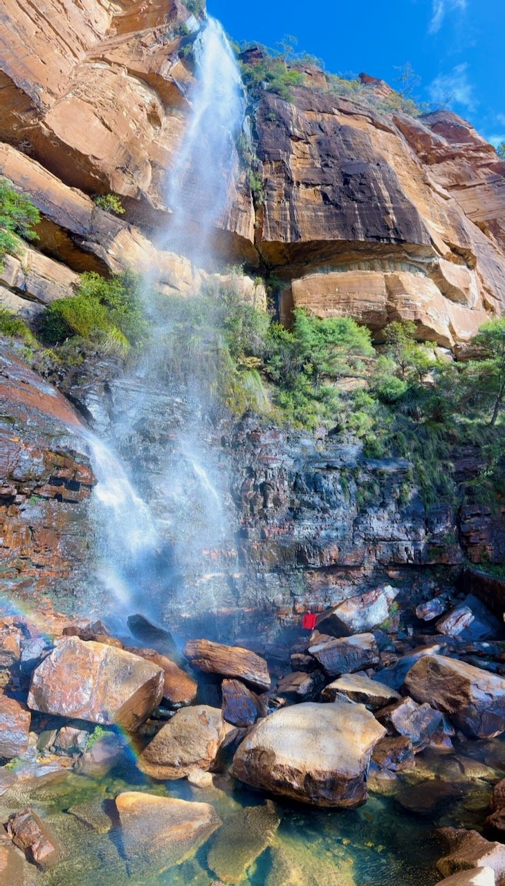 The creek drops in a single, clean 80-metre line, falling free into space. There’s a small pool a few metres from the splash zone. The roar fills the amphitheatre around us, echoing off sandstone walls. High above the Grose Valley, the place feels remote and raw.