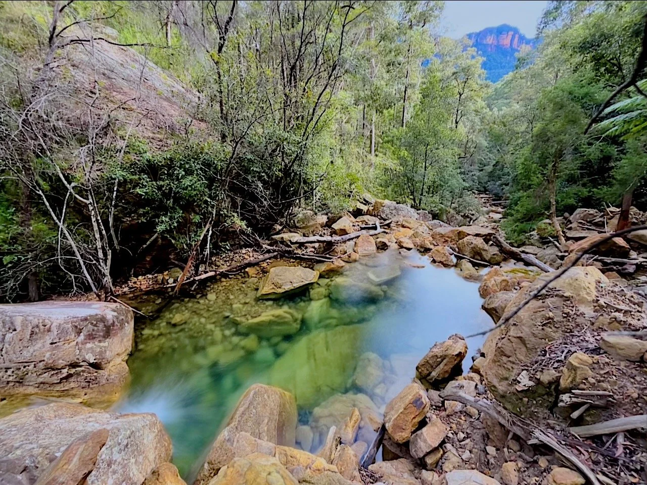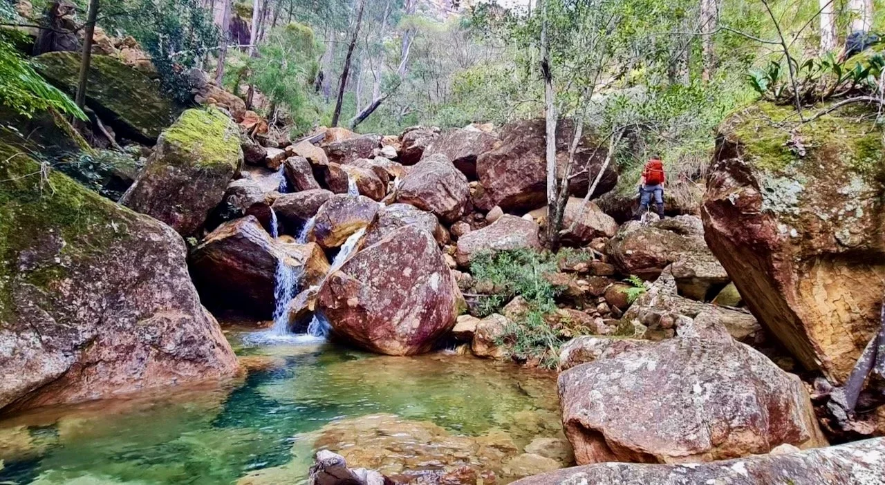 The creek narrows and steepens, and light-coloured sandstone appears underfoot, fresh and angular. We realise this is the vast volume of debris that crashed down from a partial cliff collapse near Lockley’s Pylon. The cliff scar is visible from several points around the Grose Valley including from the top of Fortress Falls. Between the rocks lie pools of startling emerald green, impossibly clear even in mid-winter.