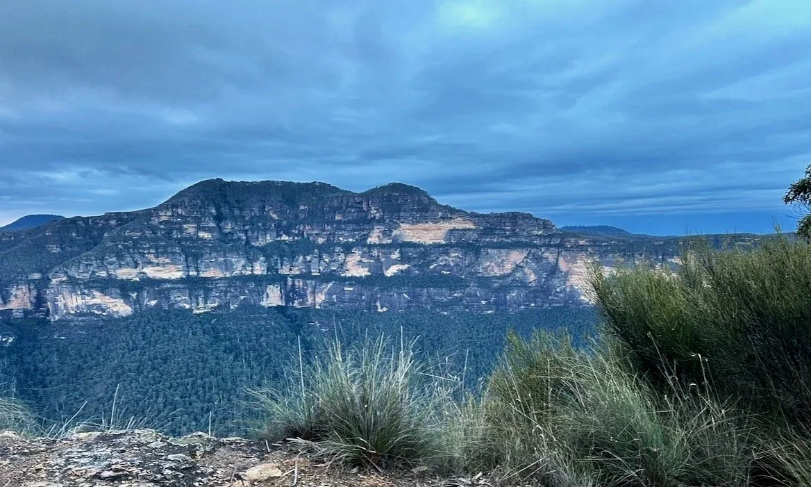 We leave Perry’s Lookdown at first light and descend the 2,200 stairs of Docker Buttress into the Grose Valley and the cold air of the Blue Gum Forest. The cliffs of Mount Banks on the other side of side of the 600 metre deep valley are majestic in the dim morning light.