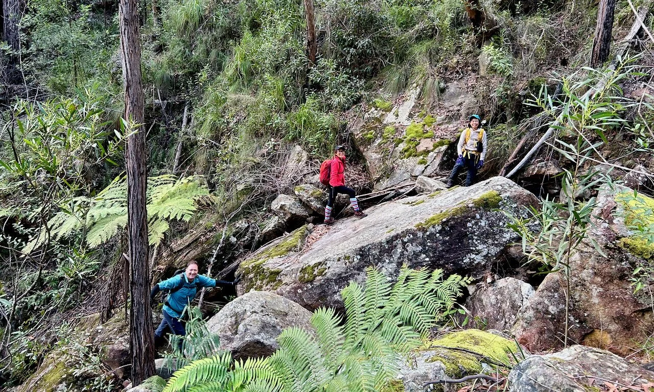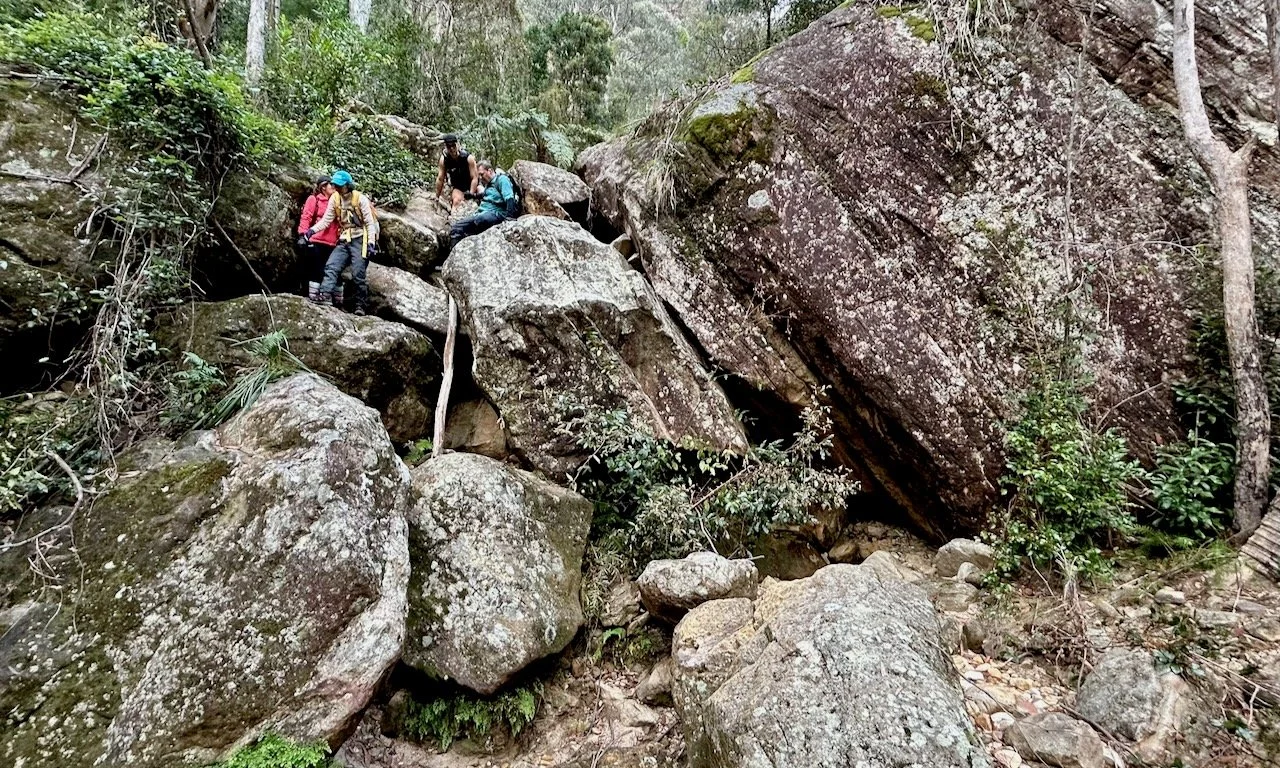 On reflection, this is a mad walk — and one of the most satisfying I’ve done. It is suitable only for fit, well-prepared bushwalkers. Clambering for kilometres over large boulders in a steep creek is tiring and not without risk, and the return descent is arguably more dangerous as fatigue sets in.