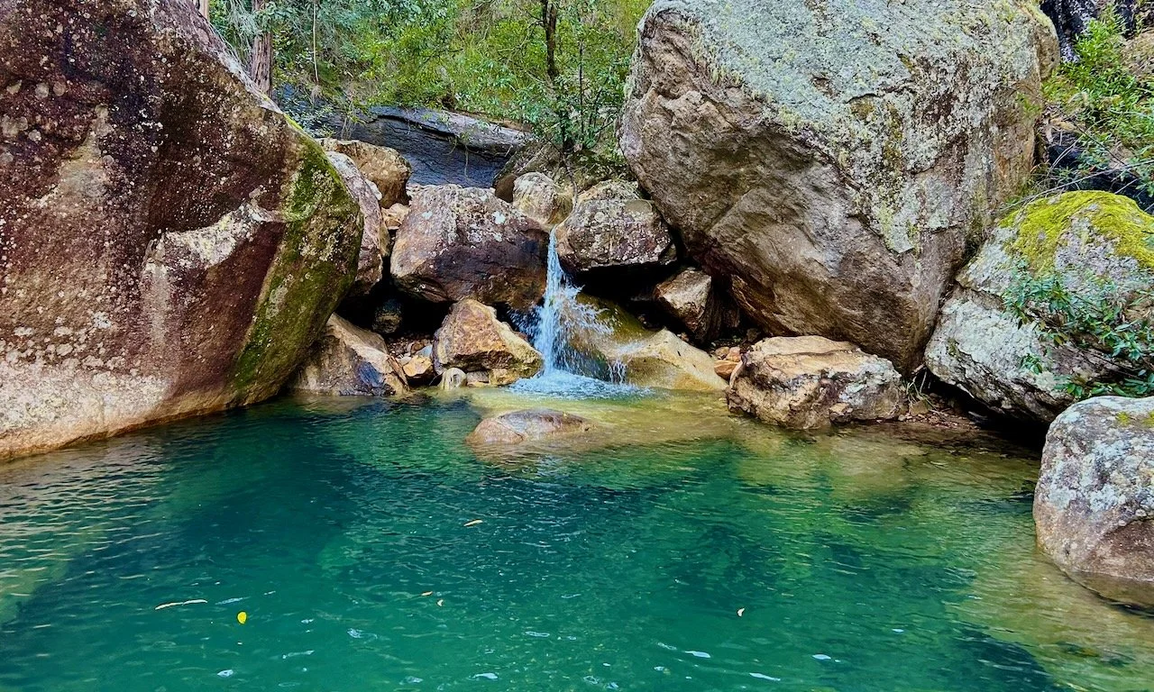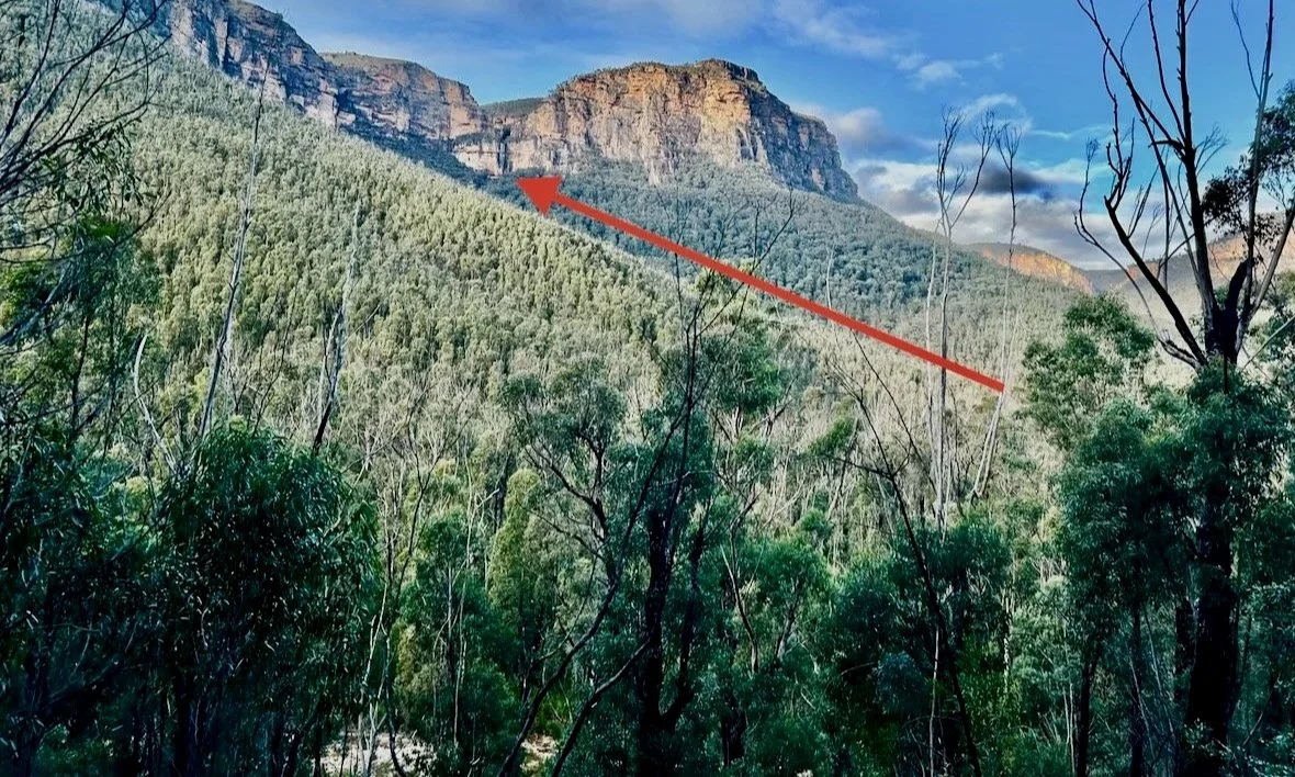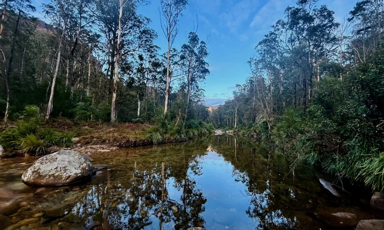 Beyond Acacia Flat, we catch our first glimpse of Fortress Creek Falls — or rather, the deep gully it has carved into the talus slopes ahead. Even from here, it looks steep and uncompromising. We walk upstream along Govetts Creek until we reach its confluence with Fortress Creek. The Creek begins gently. It doesn’t stay that way.