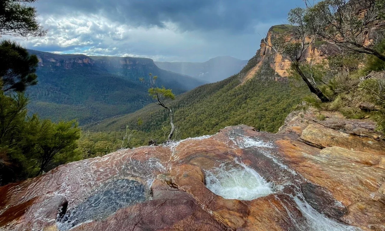 Canyoners have long been familiar with the spectacular top of Fortress Creek Falls. It marks the end of the canyon and the start of the exit trail, where the creek slides across a broad sandstone platform toward the cliff edge. Several pools sit perfectly placed like box seats above the vast sandstone theatre of the Grose Valley.
