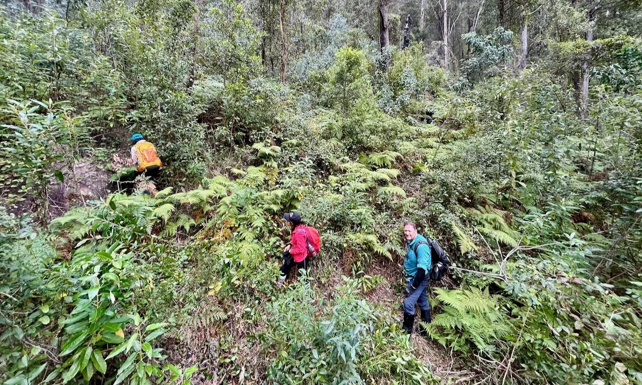 Eventually, the creek chokes on stacked boulders and small waterfalls, forcing us to abandon it and try the right bank. For a short while, progress improves. Then the slope steepens again and the vegetation closes in. Lawyer vine hooks arms and packs. The ground disappears beneath dense scrub, forcing us to feel for each step.