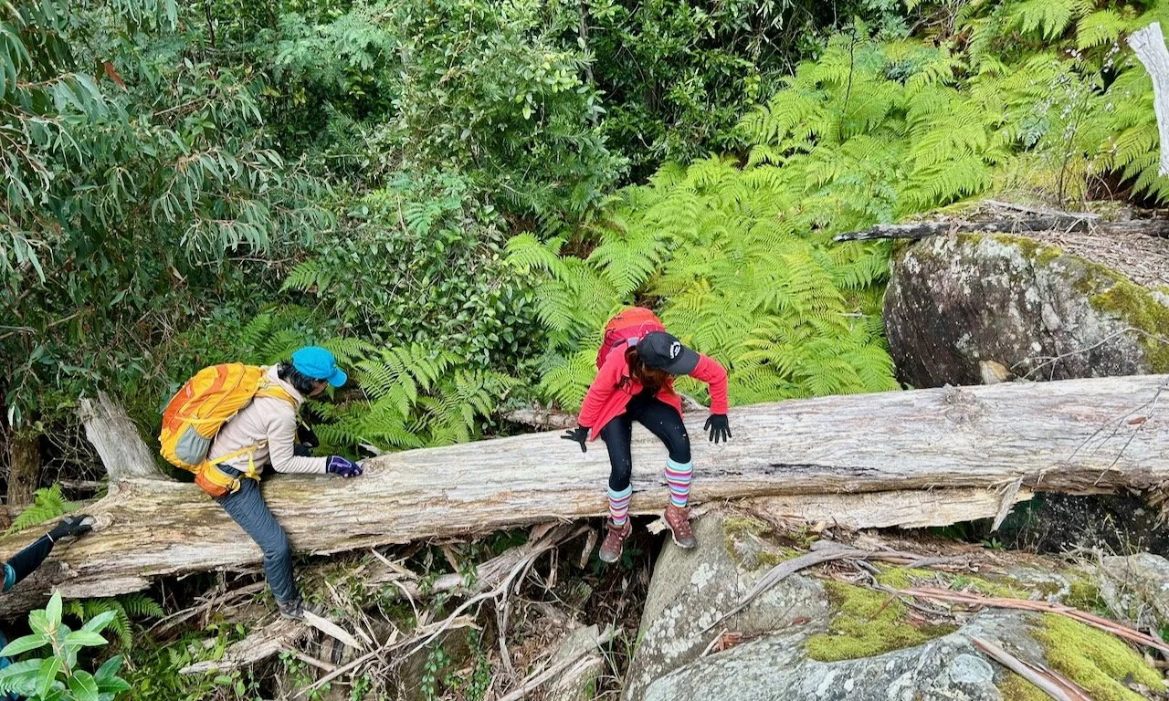 A suspended log offers brief respite. As we edge along it, we notice that beneath the vegetation to our left is a hidden drop of ten to fifteen metres, plunging down to the rocky creek bed.