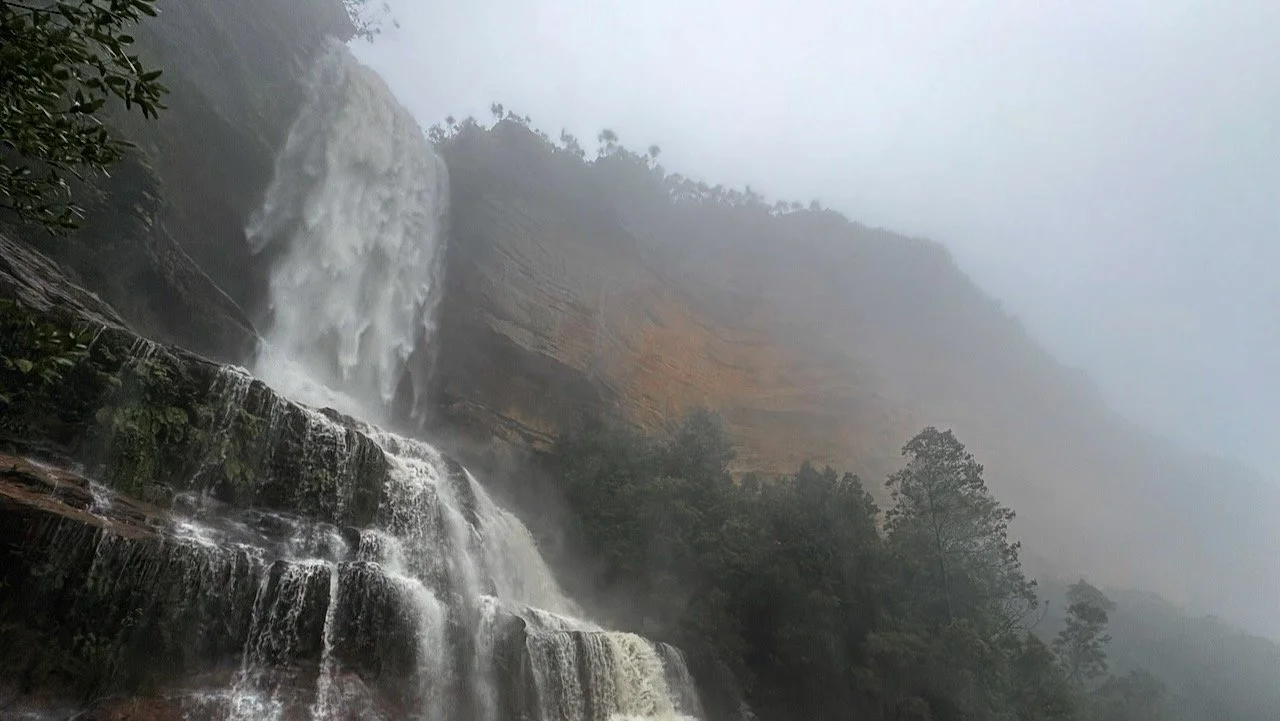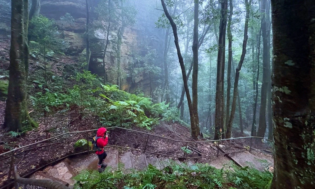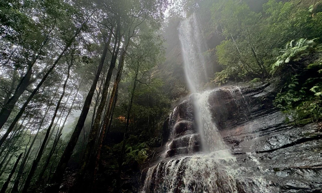 It is a day of glistening leaves and ferns, towering cliffs, overflowing streams, and drifting mist. By early afternoon, we are wet through. The main watercourse is Katoomba Falls, while a secondary stream plunges down Witches Leap and flows through Vera’s Grotto before joining the main falls below.