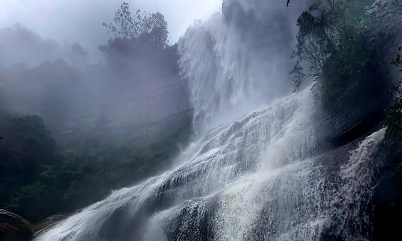 We leave the main path and scramble over boulders above flooded cascades to reach the base of the second, larger drop.
